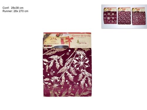 Runner da Tavola Natalizio in Velluro Bordeaux con Decorazioni Oro 28 x 270 cm