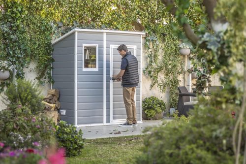 KETER TRASFORMA IL TUO GIARDINO: con la casetta addossata Manor Pent 6×4 dalle dimensioni compatte, realizzata con pannelli con finitura effetto legno graffiato