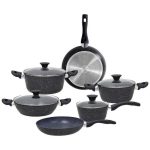 Il corpo è in fusione d’alluminio; il fondo ad alto spessore è adatto a tutti i piani di cottura, compresa l’induzione; il rivestimento interno antiaderente marmorizzato rinforzato con minerali duri garantisce resistenza ai graffi e lunga durata; il manico in bakelite color nero è ergonomico ed antiscottatura.